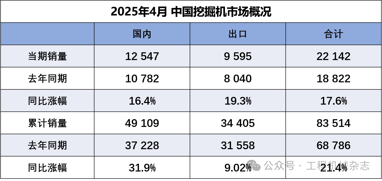 据中国工程机械工业协会对挖掘机主要制造企业统计,2025年4月销售各类挖掘机22142台,同比增长17.6%。其中国内销量12547台,同比增长16.4%;出口量9595台,同比增长19.3%。